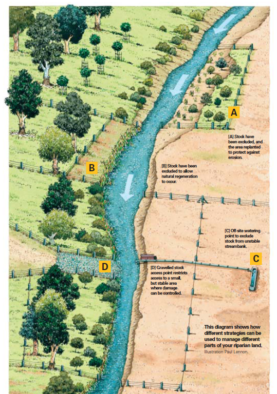 Studies have shown that removing stock from waterways and riparian areas totally, or for controlled periods, can have a significant improvement on riparian health.